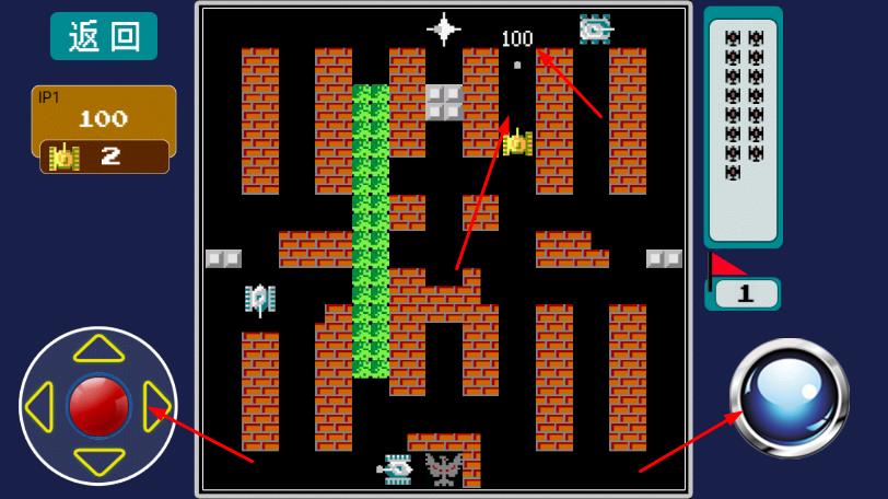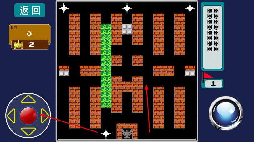 1、通過左下角方向鍵操控坦克移動(dòng),規(guī)劃路線在磚墻迷宮中前行,探索關(guān)卡區(qū)域。