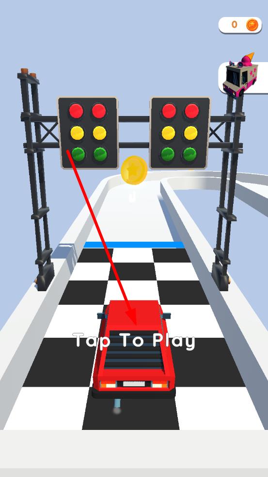 1、在起始界面觀察紅綠燈下的小車,點擊“Tap To Play”啟動小車,開始游玩,同時仔細留意道路缺口,為后續(xù)修補做準備。