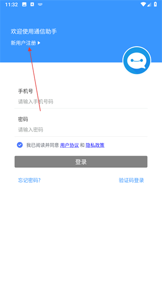 1、打開通信助手應(yīng)用,點(diǎn)擊新用戶注冊(cè)選項(xiàng)。