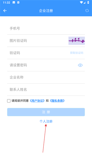 2、在企業(yè)注冊(cè)頁(yè)面,點(diǎn)擊個(gè)人注冊(cè)選項(xiàng)。