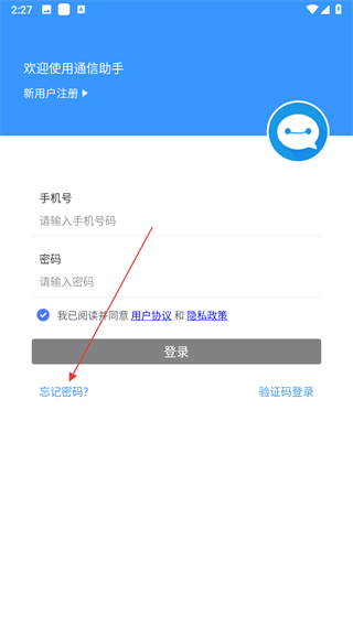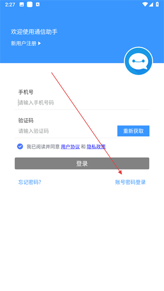 1、打開通信助手APP的登錄頁(yè)面,點(diǎn)擊下方賬號(hào)密碼登錄。