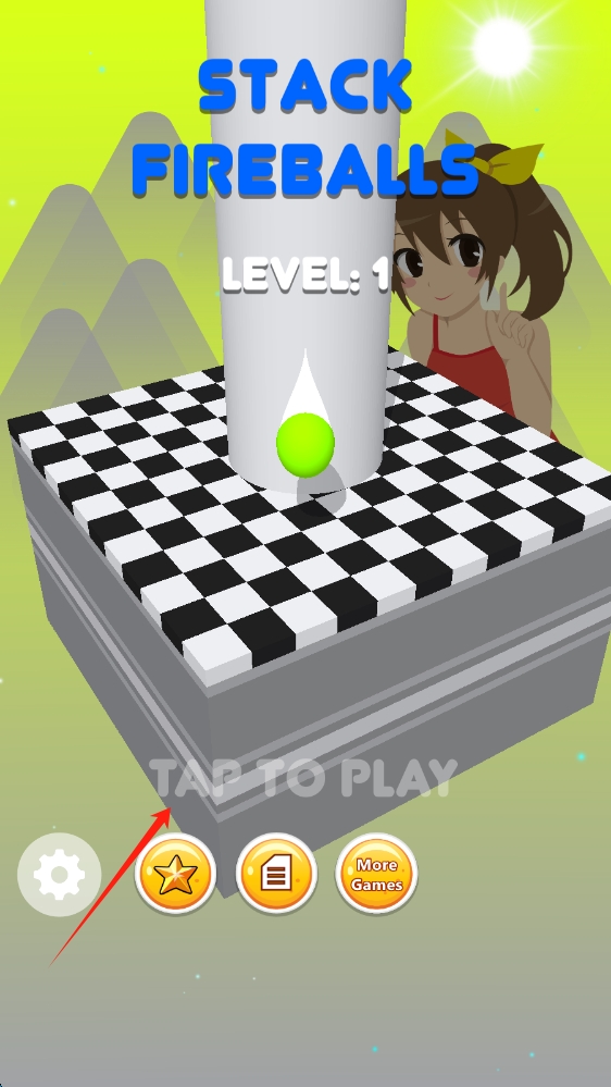 1、游戲第 1 關(guān)啟動界面,綠色球體準(zhǔn)備下落,有 “TAP TO PLAY”(點擊開始 )提示,點擊開始游戲。