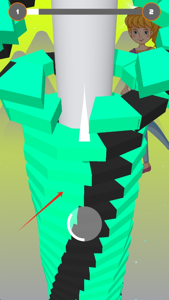 2、游戲進行中,球體下落擊碎彩色障礙物,需避開黑色部分,上方進度條顯示 “1→2”,按住下落。