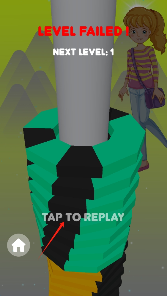 3、關(guān)卡失敗畫面,顯示 “LEVEL FAILED!”(關(guān)卡失敗 )、“TAP TO REPLAY”(點擊重玩 ),延續(xù)堆疊、點擊重開。