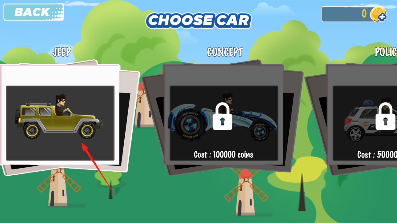 2、進(jìn)入選車界面,目前解鎖的是【JEEP車】,選它進(jìn)入游戲,其他車得攢金幣解鎖,先開著吉普感受下,看怎么操作能讓車跑得更穩(wěn)更遠(yuǎn),體驗(yàn)賽車闖關(guān)的樂趣。
