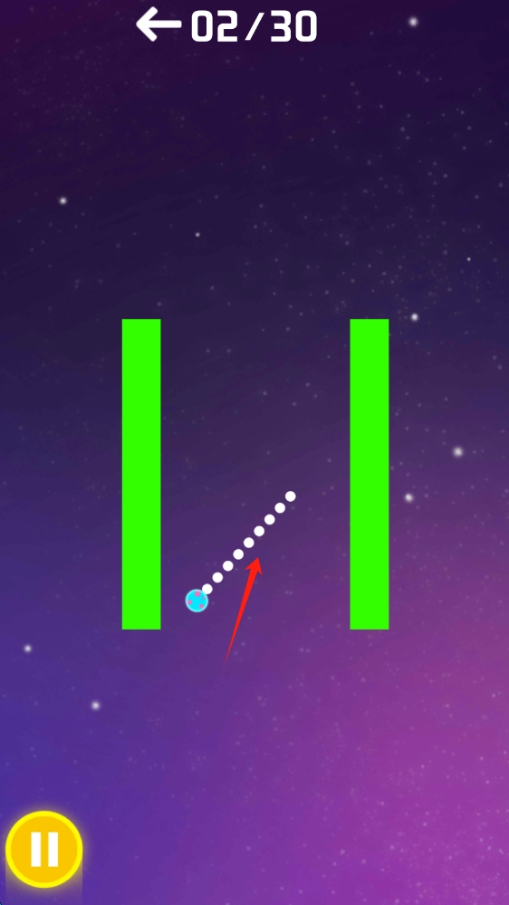 2、游戲關(guān)卡(02/30 ),藍(lán)色小球需彈射穿過綠色障礙,軌跡用白點(diǎn)顯示,按住瞄準(zhǔn)。