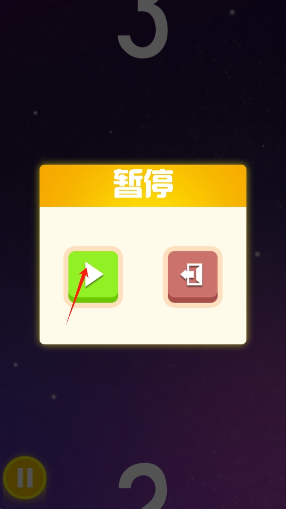 3、暫停界面,有 “繼續(xù)”(綠色播放 )、“返回”(粉色回退 )按鈕,用于控制游戲進(jìn)程,點(diǎn)擊繼續(xù)。