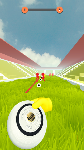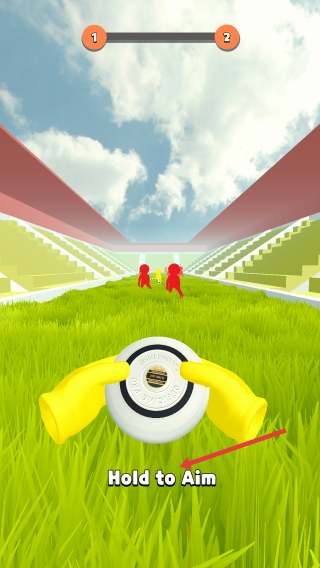 1、在Level1關(guān)卡,長按屏幕Hold to Aim瞄準(zhǔn),調(diào)整飛盤投擲角度與力度,避開紅色小人障礙。