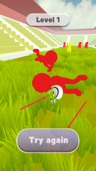 2、松開手指投擲飛盤,讓飛盤越過或繞過阻攔,飛向黃色目標(biāo)點,若被紅色小人攔截則失敗,點擊Try again重新挑戰(zhàn)。