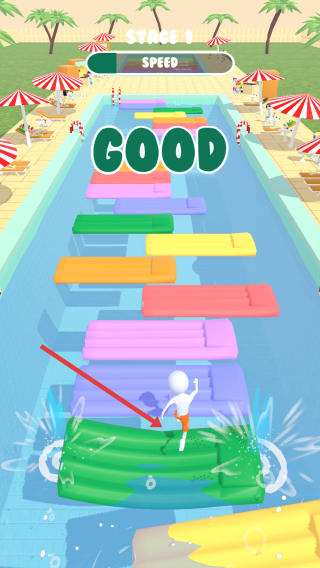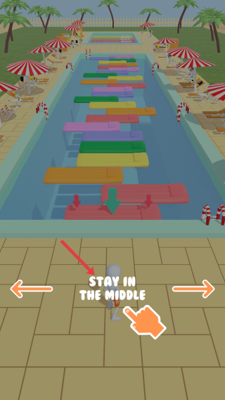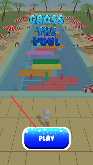 1、點(diǎn)擊PLAY開始游戲,操控角色在泳池浮板間跳躍,遵循STAY IN THE MIDDLE提示保持平衡。