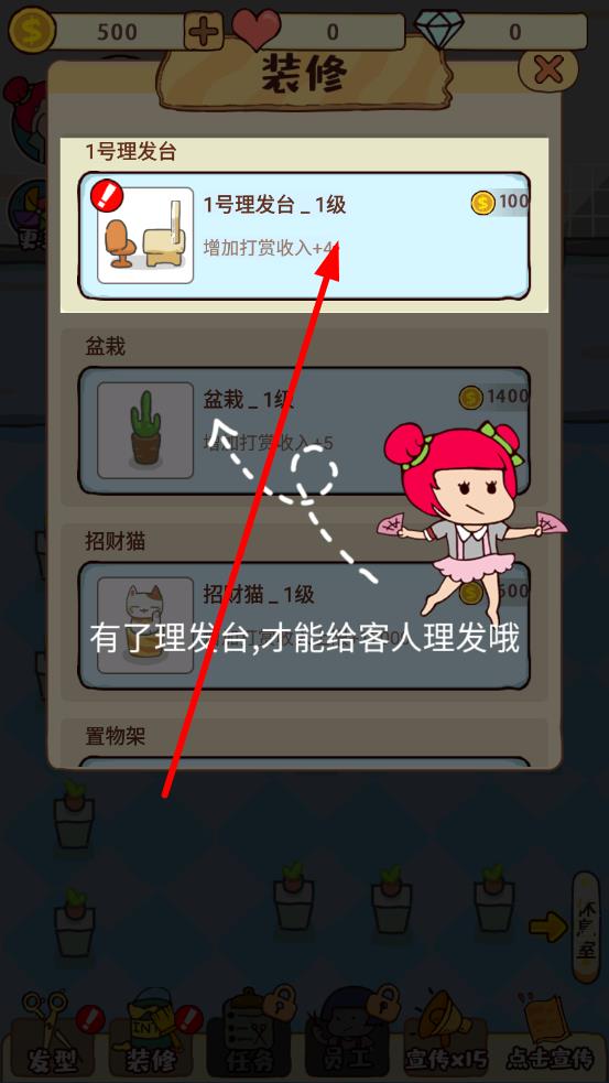 1、在“裝修”界面優(yōu)先解鎖“1號理發(fā)臺”,花費100金幣,才能夠開始做生意,有了理發(fā)臺才能為顧客理發(fā),開啟經(jīng)營第一步。