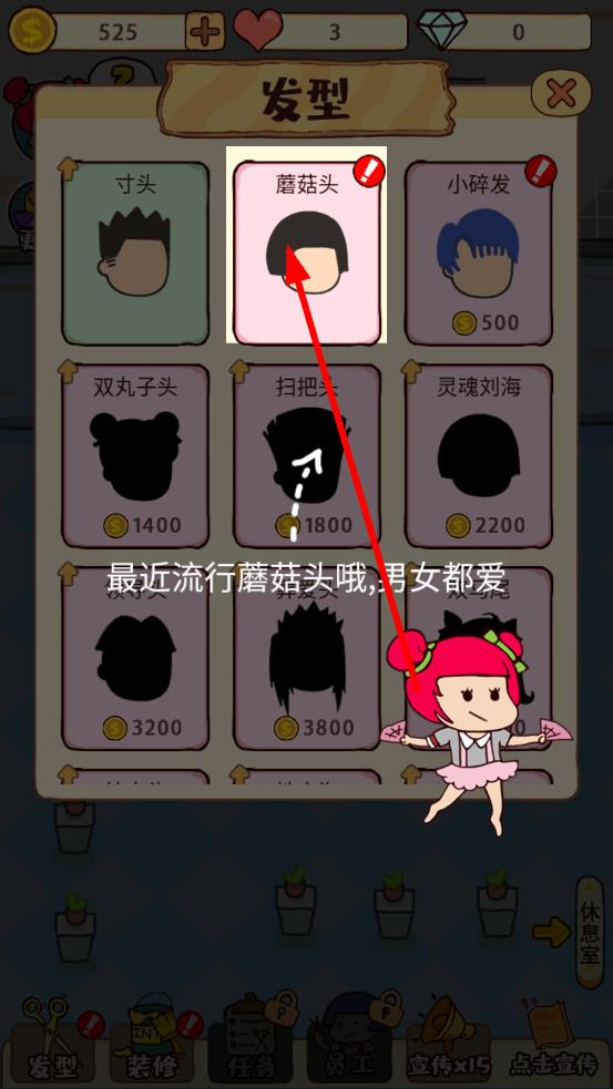 2、切換到“發(fā)型”界面,用金幣解鎖熱門發(fā)型,如“蘑菇頭”需500金幣,了解流行趨勢,為滿足顧客需求做準備,提升服務吸引力。