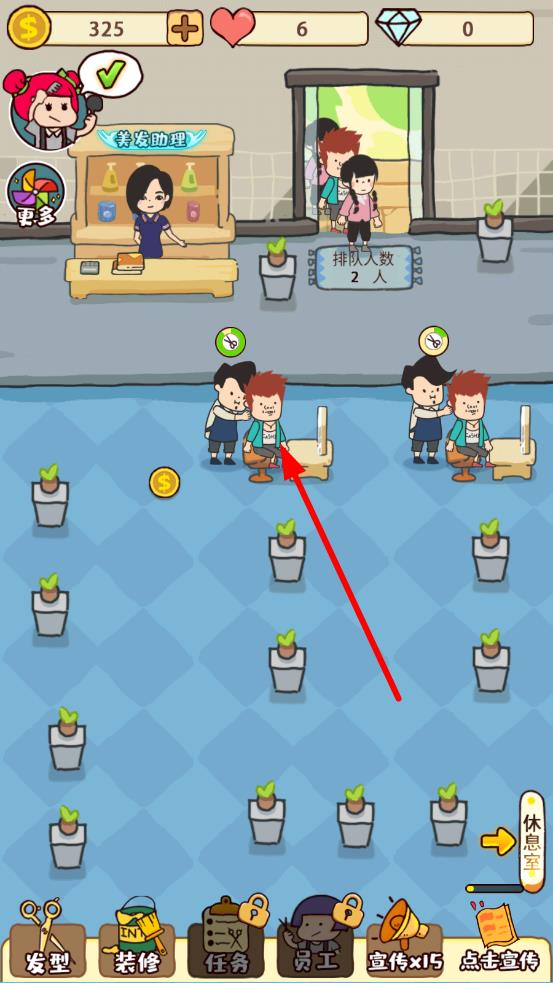 3、返回主界面,當有顧客排隊,如顯示“排隊人數(shù)2人”,點擊顧客安排至理發(fā)臺,依據(jù)需求或流行發(fā)型為其修剪,完成服務獲取金幣。