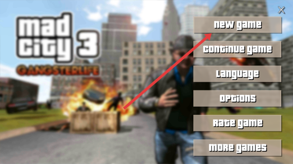 1、主菜單選new-game,開啟全新黑幫冒險,進入充滿挑戰(zhàn)的瘋狂城市,開啟專屬游戲歷程。