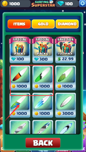 2、裝備商店陳列多款特色滑板,通過(guò)積累游戲金幣解鎖不同屬性與造型的沖浪板。