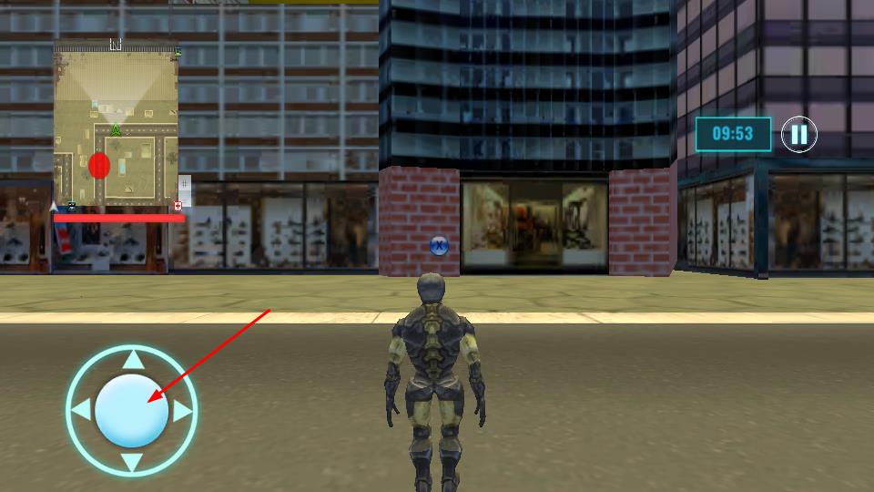 3、玩家在操作角色時通過左下角虛擬搖桿控制移動方向,在城市場景中探索、戰(zhàn)斗,完成游戲任務(wù)。