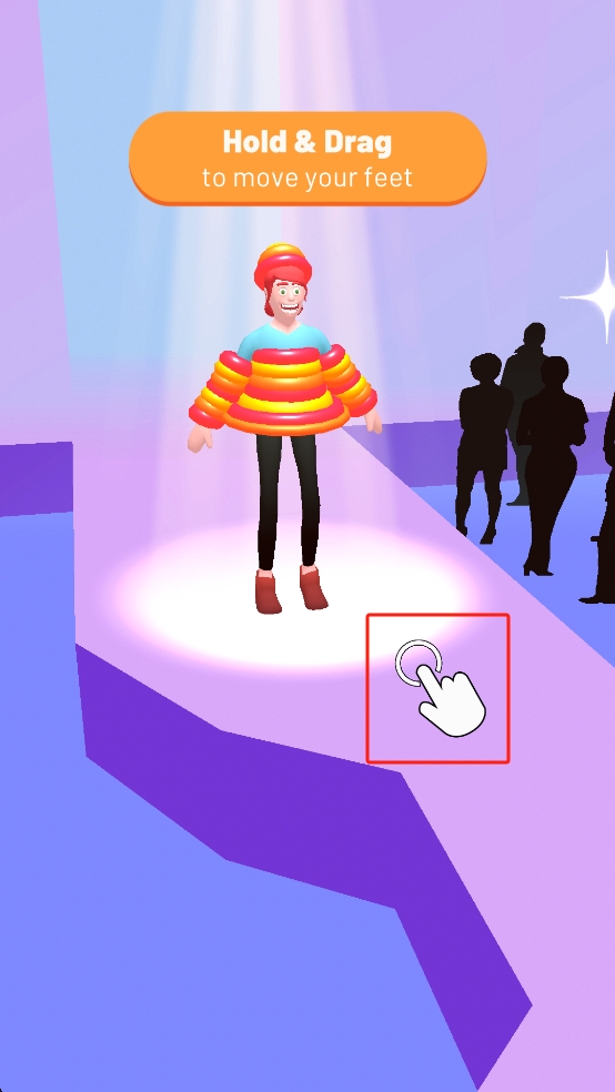 1、開局依據(jù)提示,長按紅框內(nèi)區(qū)域并拖動,控制角色腳部移動,準(zhǔn)備在T臺行進,注意舞臺兩側(cè)觀眾,保持走秀節(jié)奏。