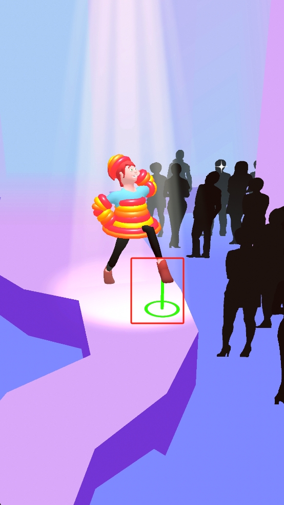 2、走秀中緊盯紅框內(nèi)角色腳部與綠色落點,長按拖動讓腳精準(zhǔn)落在落點上,跨越T臺障礙,維持平衡,順利推進關(guān)卡。