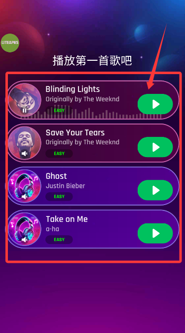 1、在音樂選擇頁面,輕觸曲目旁亮起的綠色按鈕,即可載入對應(yīng)節(jié)奏挑戰(zhàn)。