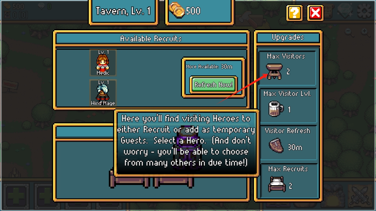 3、酒館界面,優(yōu)先升級(jí)Max-Visitors,增加訪客數(shù)量,助力招募更多英雄,點(diǎn)擊查看物品。