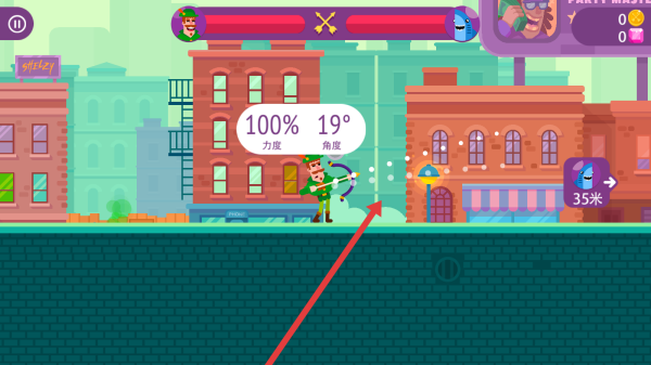 3、戰(zhàn)斗時(shí)可以滑動(dòng)屏幕調(diào)整力度100%、角度19°,發(fā)射弓箭,精準(zhǔn)打擊對(duì)手擊敗他取得勝利。