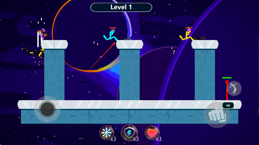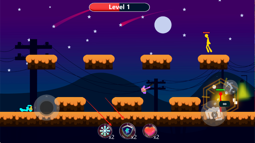 3、最下方是三個(gè)道具,當(dāng)自己的血量快掉光之后,就使用第三個(gè)道具,恢復(fù)血量,使用第一個(gè)道具就可以短暫控制場(chǎng)上所有的火柴人停住。