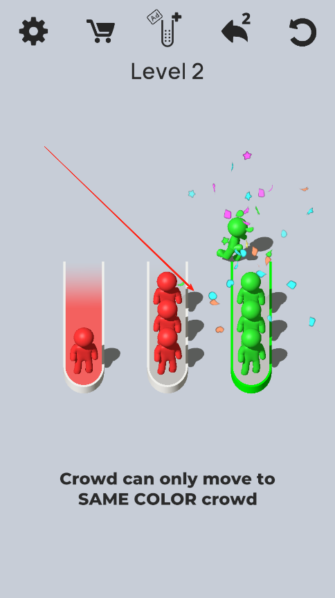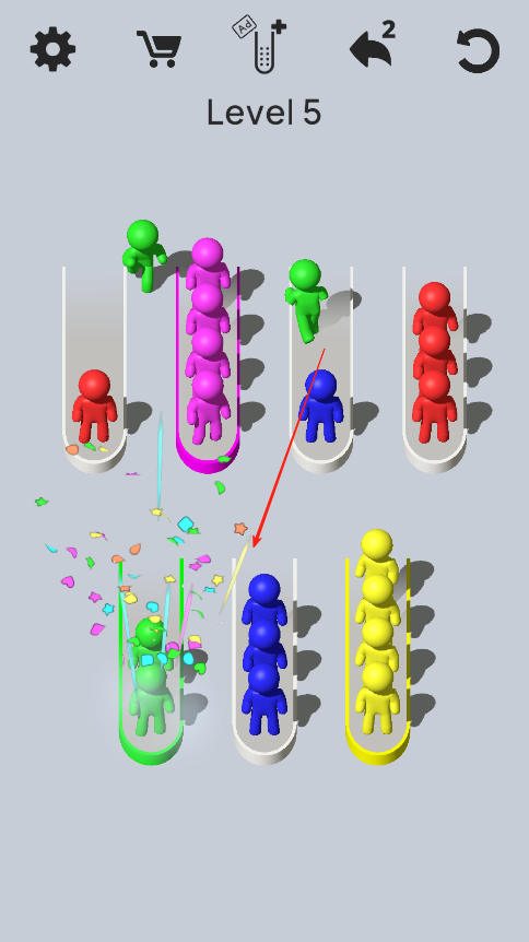 1、進(jìn)入游戲后,選擇初始關(guān)卡,觀(guān)察試管中不同顏色小人的分布,熟悉點(diǎn)擊試管移動(dòng)小人的操作方式,嘗試將第一個(gè)試管中的小人移至合適位置。