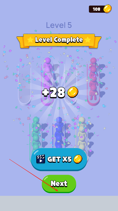 3、成功將所有試管中的小人按顏色分類(lèi)排好后,系統(tǒng)判定關(guān)卡完成,發(fā)放通關(guān)獎(jiǎng)勵(lì),解鎖下一難度關(guān)卡,開(kāi)啟更復(fù)雜的排序挑戰(zhàn)。