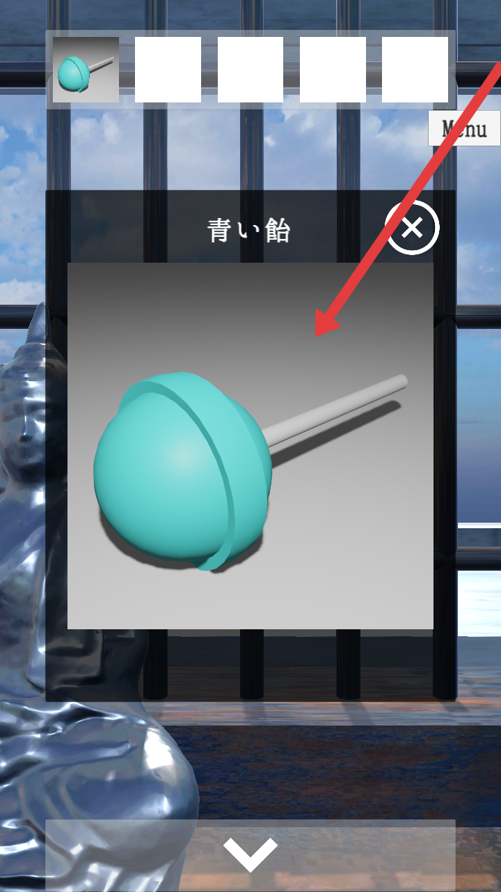 3、拾取藏在銀色佛像身后標(biāo)注青い飴藍(lán)色糖果的道具,需要點(diǎn)擊收集該道具到我們的道具欄中。