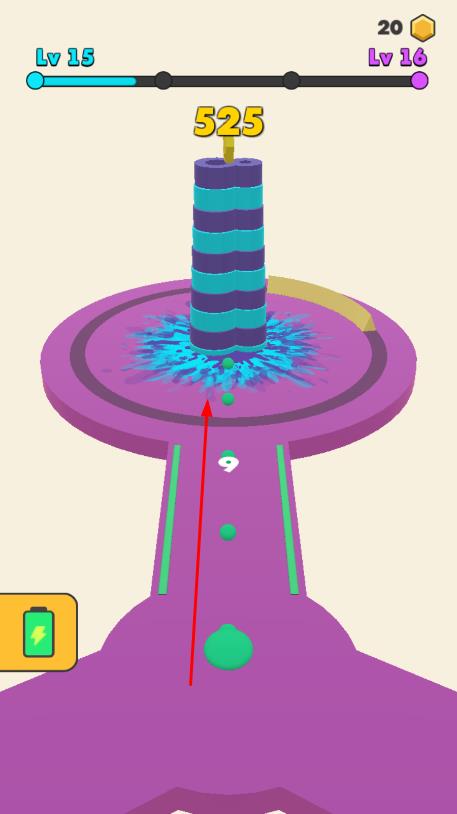 1、控制綠色小球沿軌道滾動,撞擊紫色平臺上的彩色圓柱,使其破碎。