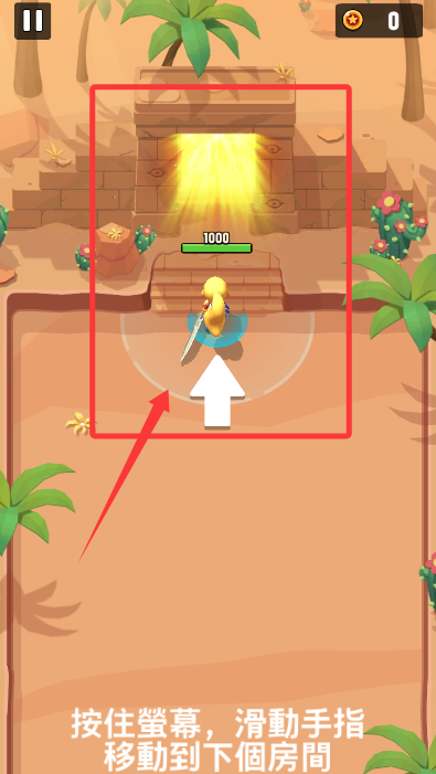 1、進(jìn)入游戲場(chǎng)景,按住屏幕滑動(dòng),操控角色朝發(fā)光門移動(dòng)進(jìn)入新區(qū)域。