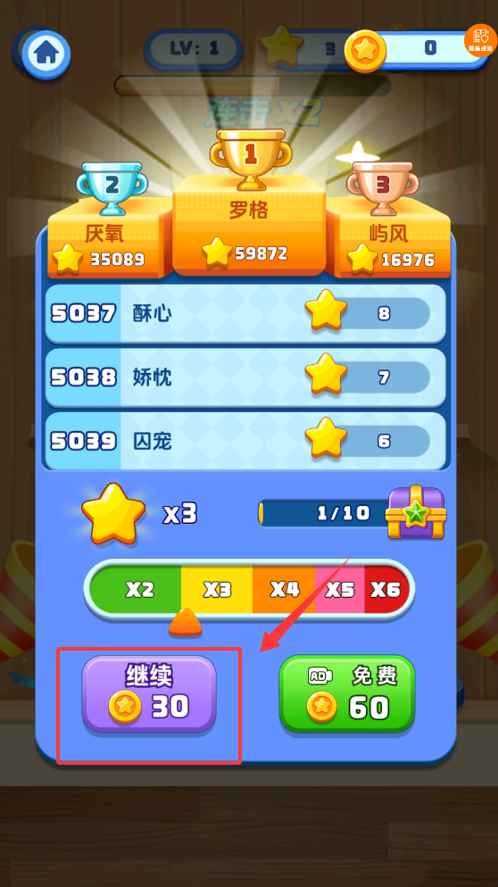 3、通關(guān)后點擊繼續(xù)按鈕挑戰(zhàn)下一關(guān)。