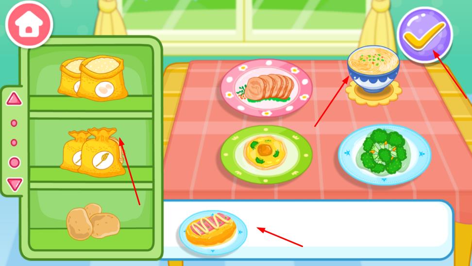 2、從食材庫選取食材,放置餐桌對應(yīng)餐盤,組合餐食,點擊右上角的√確認搭配。