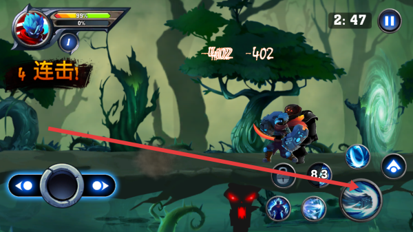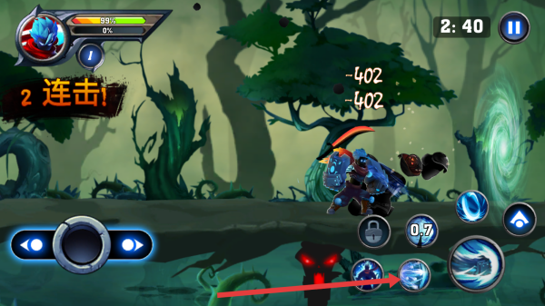 1、左手邊滑動(dòng)虛擬搖桿,靈活調(diào)整角色站位已經(jīng)走位,躲避敵人攻擊同時(shí),找最佳得攻擊角度。