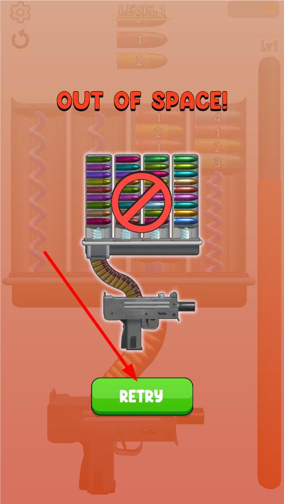 3、若合成超出空間,觸發(fā)“OUT OF SPACE!”提示,點擊“RETRY”重新挑戰(zhàn)本關卡;成功合成合理配置,就能用新武器投身射擊冒險,對抗敵人、突破關卡。