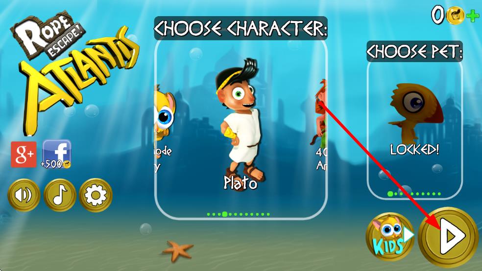 1、選擇角色Plato,點擊開始按鈕,進入RopeEscape游玩。