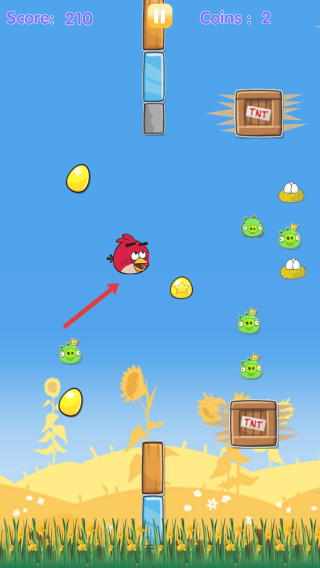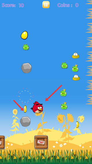 3、控制紅色小鳥(niǎo)飛行軌跡穿過(guò)金幣區(qū)域利用慣性撞擊綠豬與TNT箱得分。