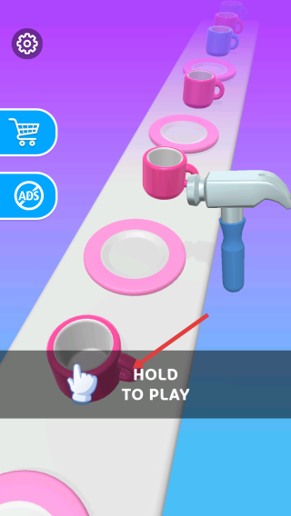 1、游戲開(kāi)局,看到HOLD TO PLAY提示,長(zhǎng)按屏幕控制錘子,對(duì)準(zhǔn)軌道上的杯子,準(zhǔn)備敲擊。