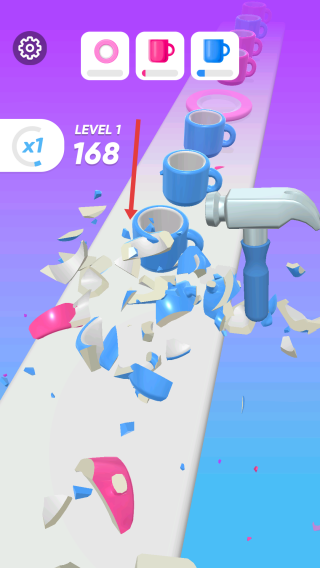 2、進(jìn)入LEVEL1,在軌道滑行中,看準(zhǔn)藍(lán)色杯子位置,用錘子精準(zhǔn)擊碎,注意避開(kāi)其他顏色器具。