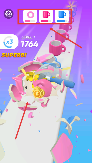 3、持續(xù)擊碎對(duì)應(yīng)上方圖標(biāo)顏色的杯子粉盤、粉杯、藍(lán)杯,收集金幣,達(dá)成SUPERB評(píng)價(jià),推進(jìn)關(guān)卡。