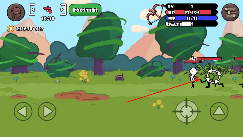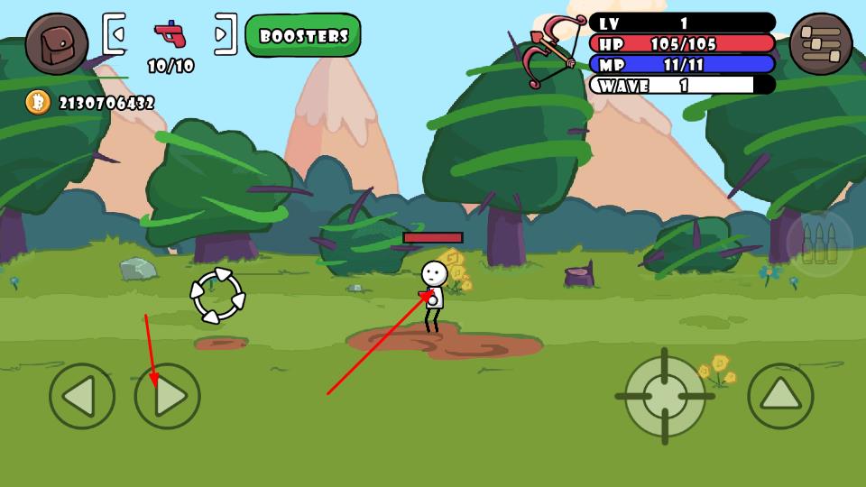 2、玩家在游戲場(chǎng)景,點(diǎn)擊左側(cè)前進(jìn)箭頭按鈕,操控火柴人移動(dòng),探索地圖、接近敵人。