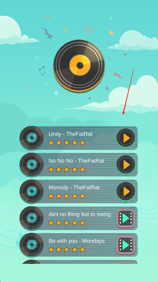 1、進(jìn)入游戲后,在主界面選擇喜歡的歌曲和關(guān)卡,點(diǎn)擊開(kāi)始按鈕,跟隨引導(dǎo)熟悉點(diǎn)擊屏幕控制小人跳躍、滑動(dòng)屏幕轉(zhuǎn)向的基礎(chǔ)操作,開(kāi)啟第一局跑酷挑戰(zhàn)。