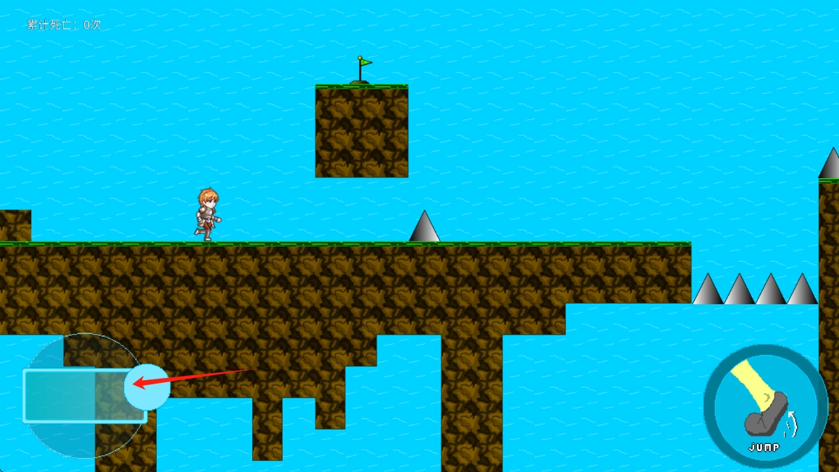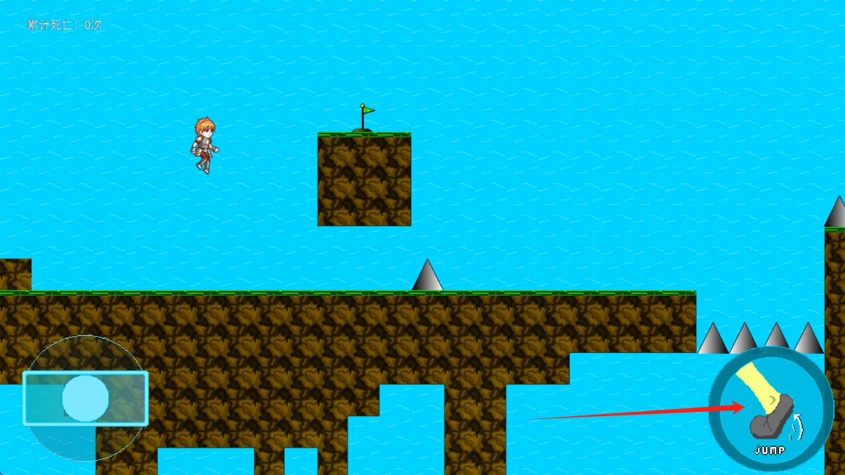 3、遇到溝壑或尖刺,點擊右側(cè)JUMP按鈕跳躍,抵達旗幟位置通關(guān),點擊按鈕跳躍。
