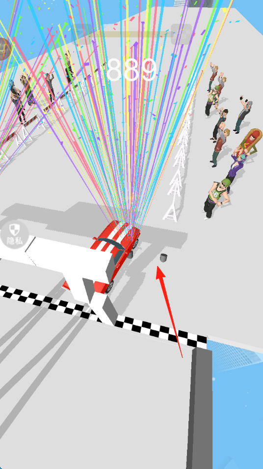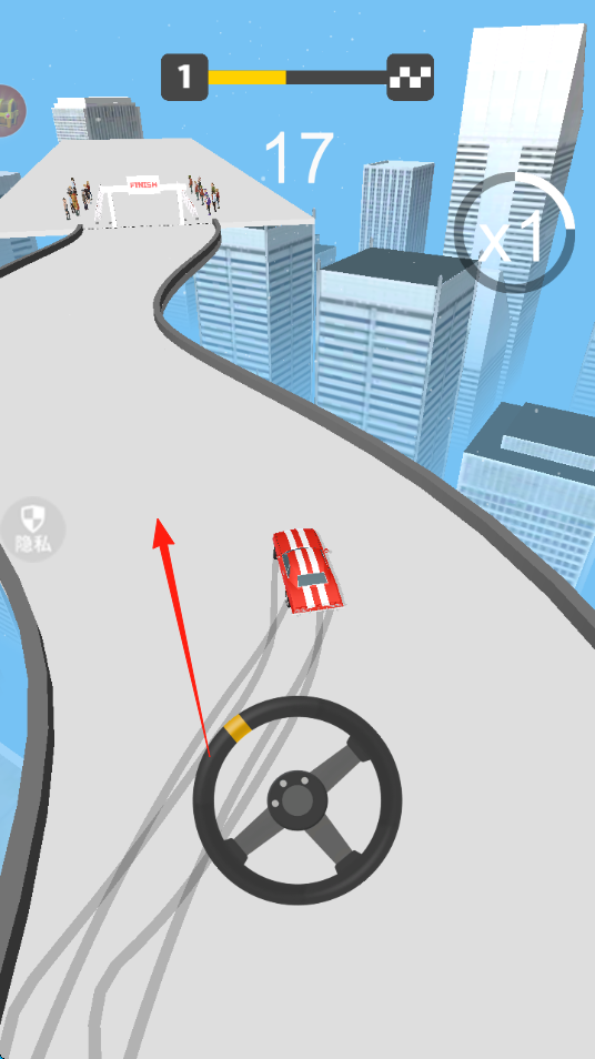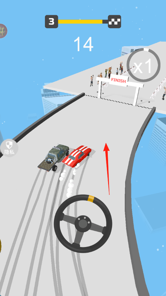 3、接近終點,留意箭頭指向的小障礙,提前微調(diào)方向避讓,全力加速沖過FINISH線,完成比賽,爭取好成績。