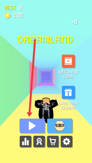 1、根據(jù)箭頭指引,點(diǎn)擊藍(lán)色播放按鈕,進(jìn)入DREAMLAND游戲關(guān)卡,操控角色開始在彩色通道中冒險(xiǎn)。