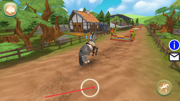 2、騎馬闖關時,移動下方的圓圈操控角色沿賽道前進,遇障礙提前調(diào)整方向,點擊跳躍按鈕右下角讓馬跨越。