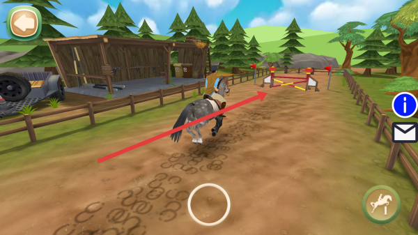 3、日常照顧馬匹喂食、清潔,維持健康值,騎馬闖關中,點擊馬兒和下方圓圈操控馬兒跨越障礙。