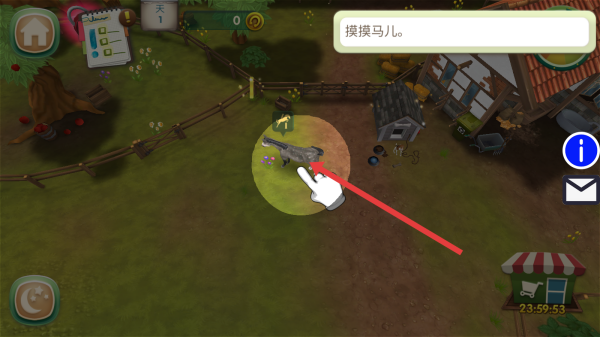 1、進入游戲,首日任務摸摸馬兒,點擊馬匹所在區(qū)域,完成互動,提高跟馬兒的親密度。