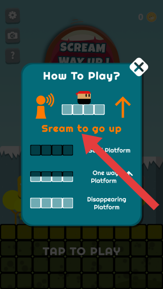 1、標(biāo)題介紹操作,規(guī)則是通過尖叫控制上升,玩家需利用發(fā)聲等操作讓角色在平臺上向上闖關(guān)。
