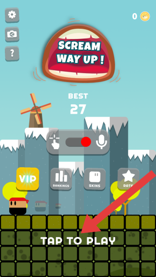2、玩家點(diǎn)擊TAPTOPLAY即可開始游戲,通過尖叫控制角色向上移動,界面還顯示了最佳成績等功能選項(xiàng)。